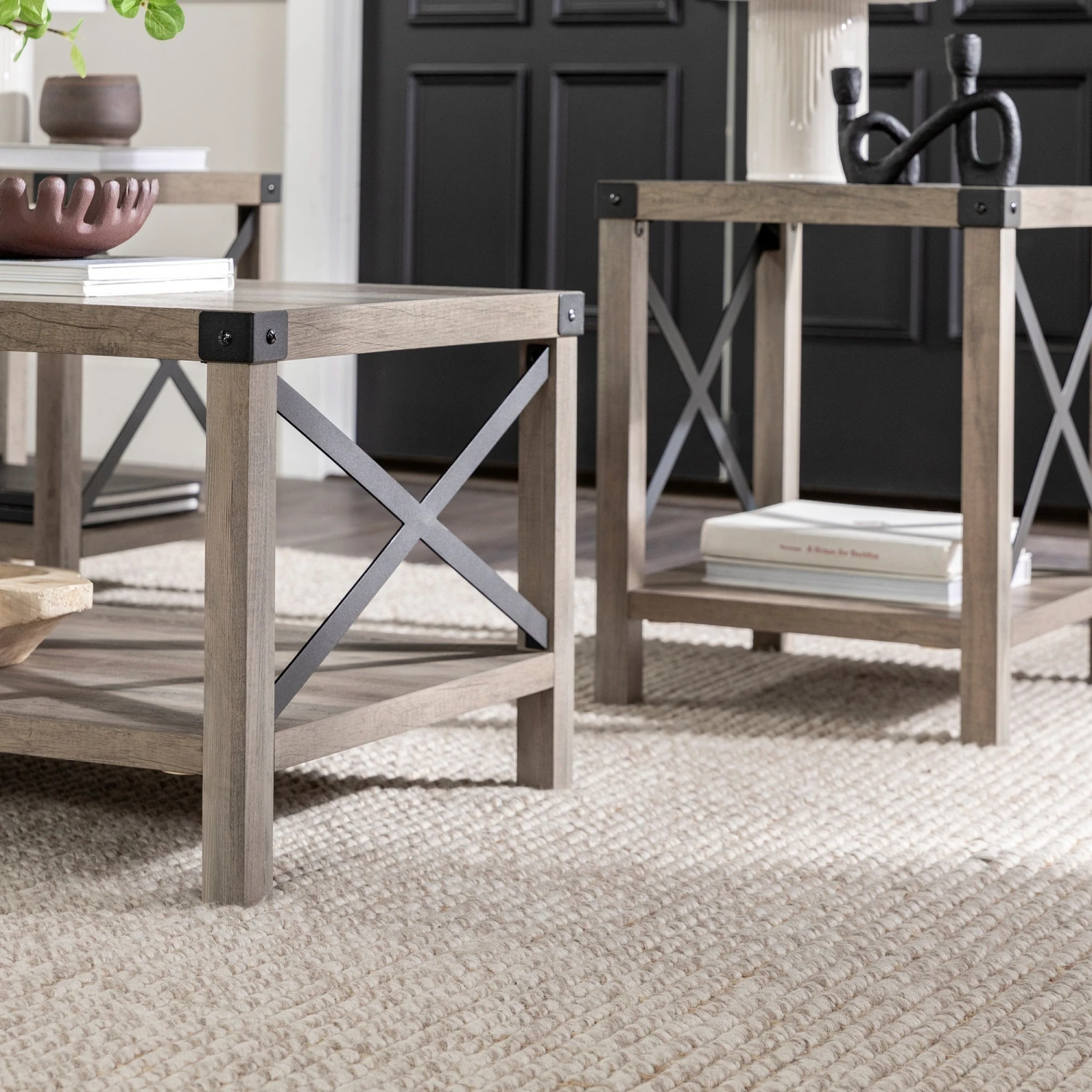 Lasso an industrial farmhouse feel into your home with this wood and metal accent three-piece table set. Mixed materials come together to deliver a rustic personality full of dynamic details. Both the rectangular coffee table and square side tables have lower shelves and feature metal X accents on two of their sides while metal brackets embrace the four top corners of each table. This set includes two side tables and one coffee table.