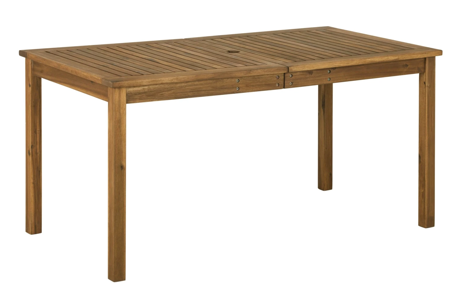 One part table, one part bench and two parts chair, this four-piece patio set is the perfect recipe to achieve your outdoor dining dreams. This solid acacia wood dining set is weather resistant and sturdy. The table features an umbrella hole so you can still enjoy eating in your backyard with some shade coverage. Both the chairs and bench have an engaging chevron slat design that would complement any number of outdoor designs.