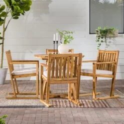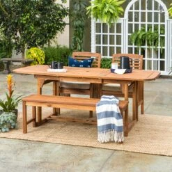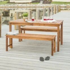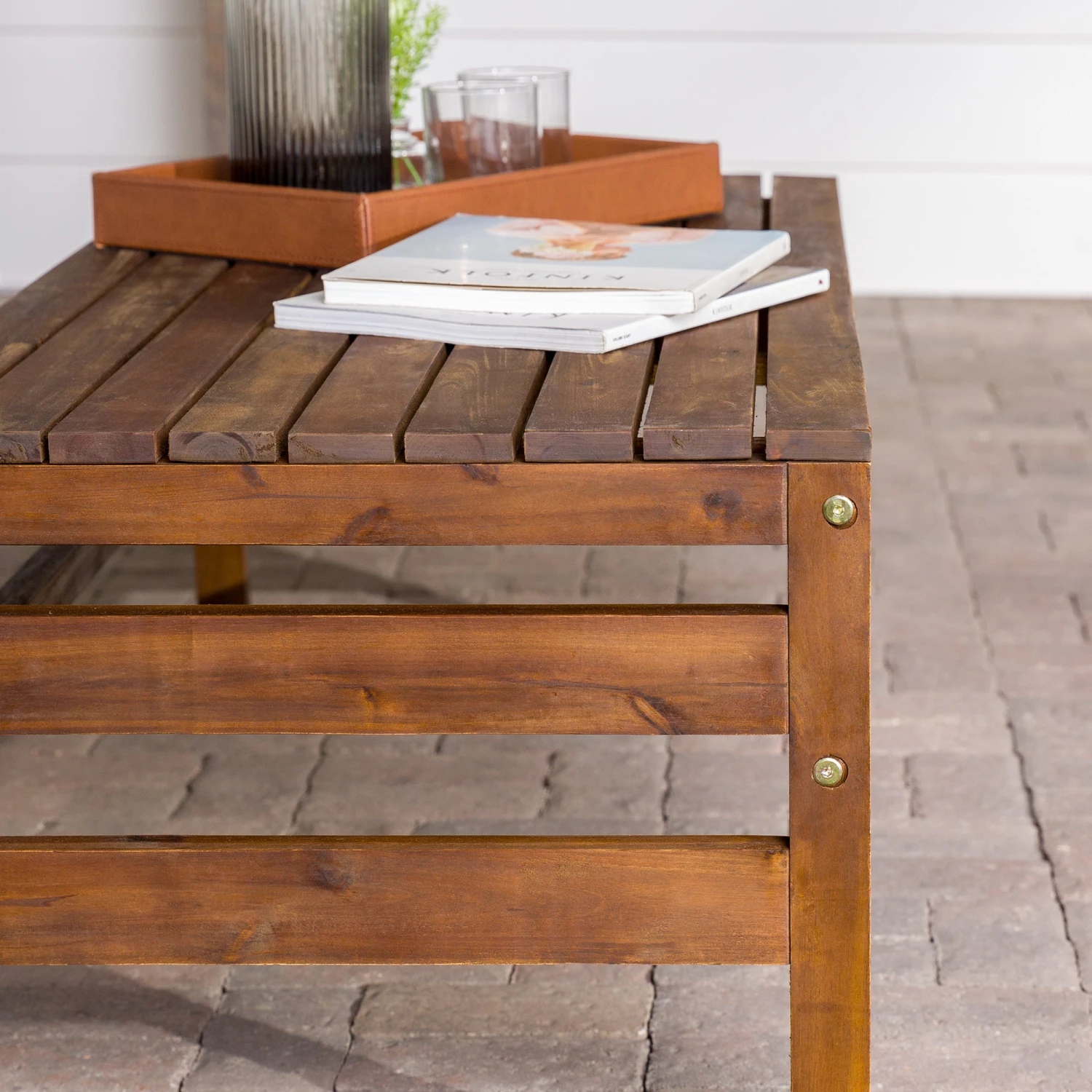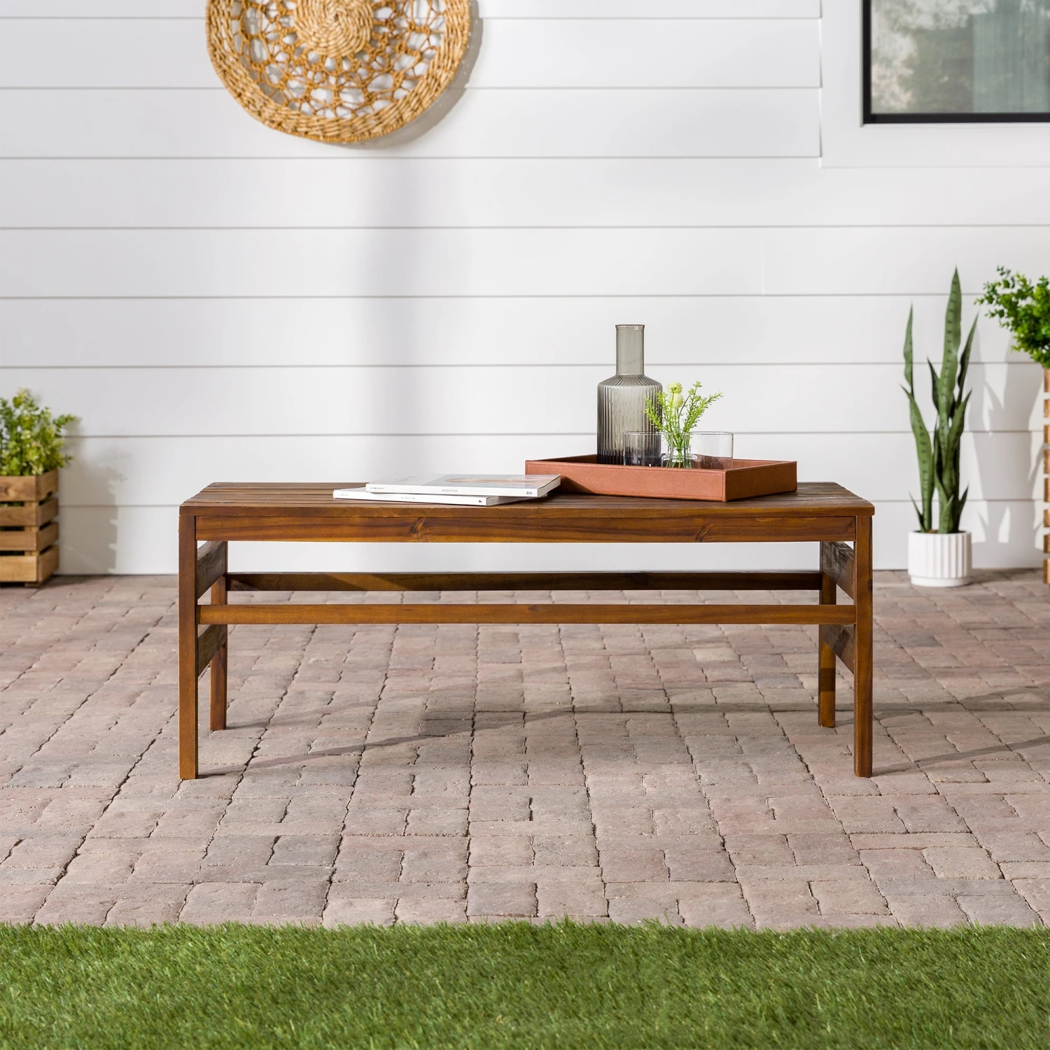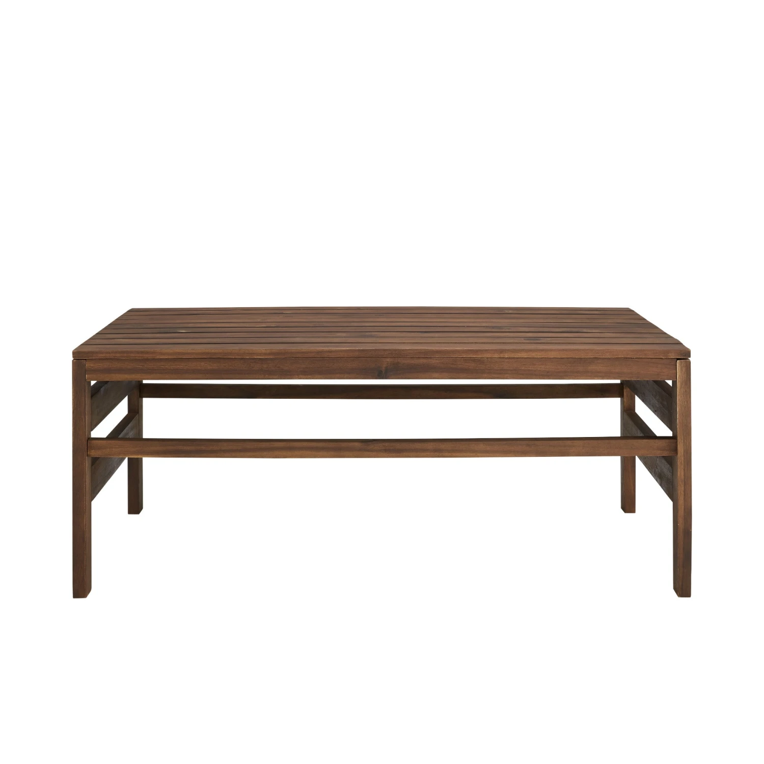 Spin stories of getaway plans and favorite family memories sitting around your new patio set up accented by this acacia wood outdoor coffee table. A slatted top and simple structure bridge a perfect bond between modern and boho-inspired style, so this piece perfectly complements anything from hanging woven egg chairs to a sleek modular sectional. Constructed from solid acacia wood, this cocktail table will unfailingly help host beverages or barbecue atop its sturdy, weather-resistant surface for each and every pool party, family get-together, or s’mores roast.