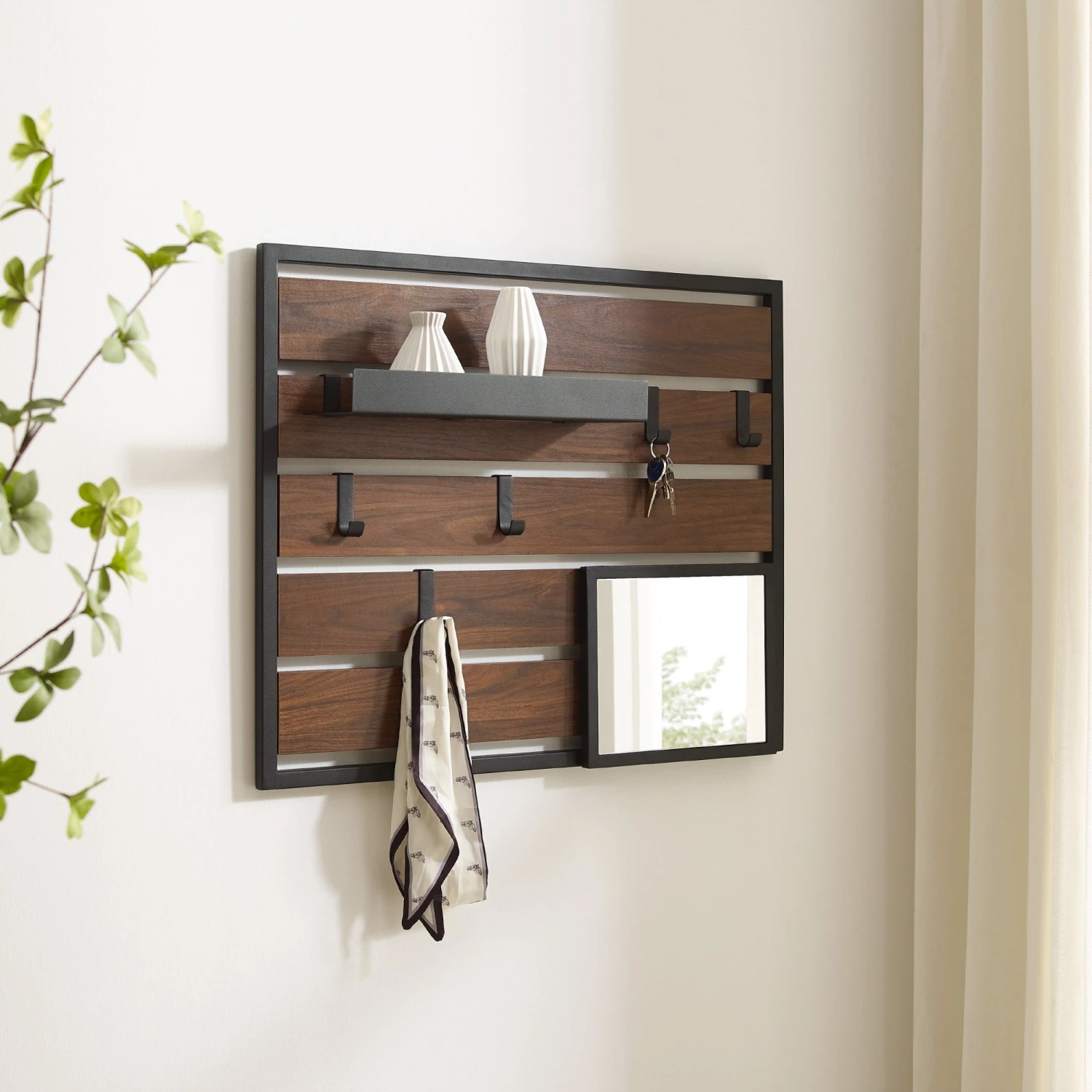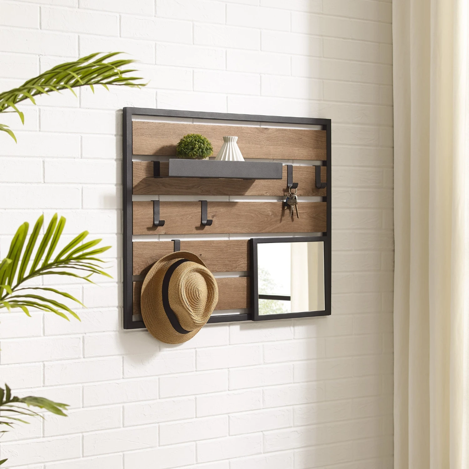 It’s the stylish grab-and-go station you’ve been waiting for–and it’s even better than you imagined. This mixed-material wall organizer features a cool, modern urban aesthetic while it boasts a functionality even more impressive. Each hook supports up to five pounds, so you can easily hang your lanyards, bags, or décor exactly where you want it. A removable shelf offers even more storage for keys or mail, while the sleek mirror makes this the perfect pitstop before you head out the door. Whether it’s displayed in your room, entryway, or mudroom, you’ll wonder how you ever lived without this handy-dandy wall organizer.