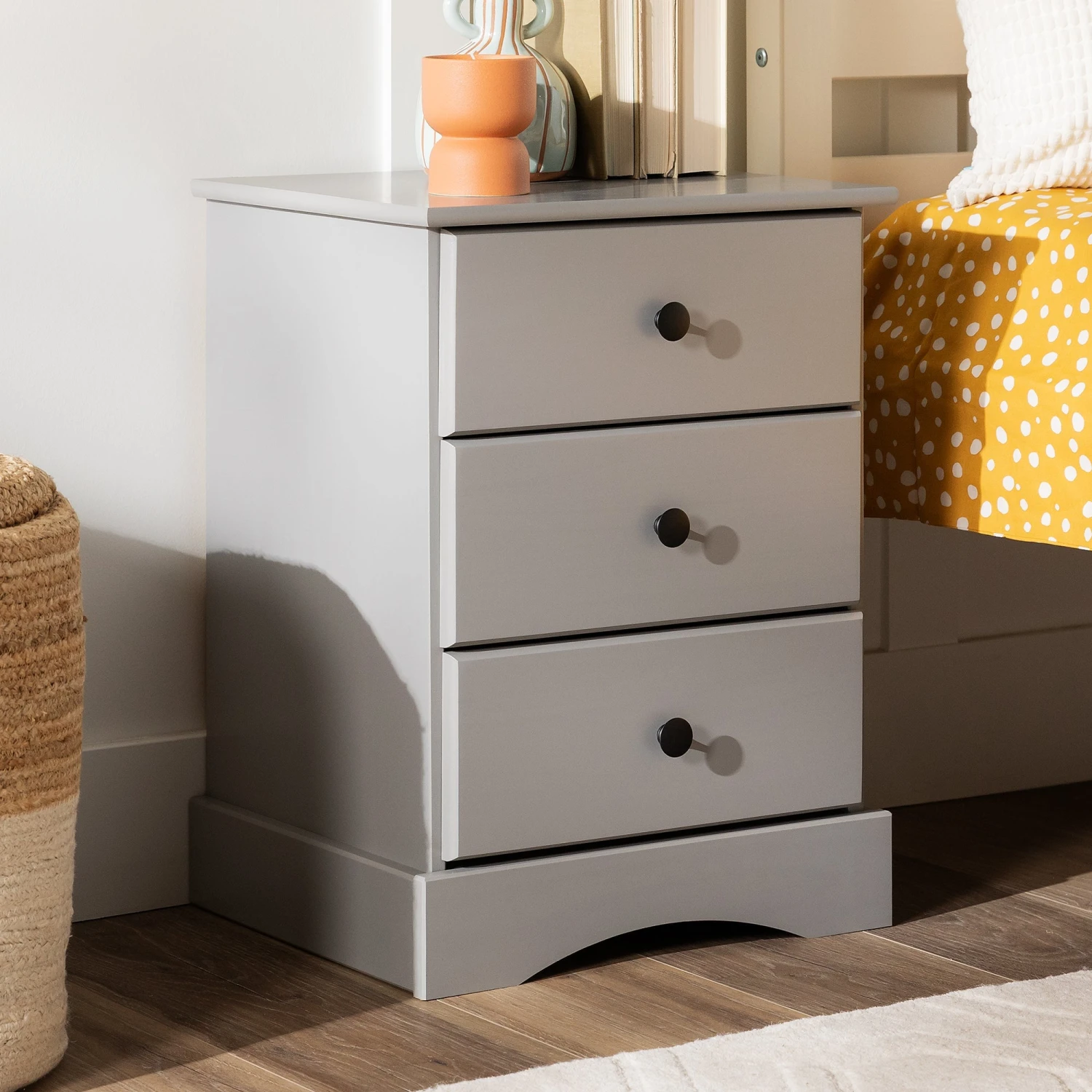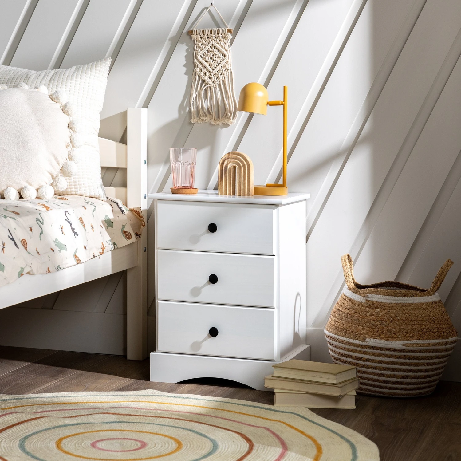 Pull some inspiration from your daydreams of the countryside with this quintessentially cottage-inspired nightstand. That somewhere far, far away doesn’t seem so distant with the accent table’s artisanal charm and solid wood silhouette, responsibly sourced from renewable forests. The timeless profile showcases bucolic detail, while metal drawer handles offer a subtle contemporary touch. Three drawers provide copious hidden storage for anything, from children’s toys to your own nighttime necessities. The perfect accent to appeal to both youth and mature spaces, this bedside table encourages you to get lost in a whimsical bedtime story or your favorite book.