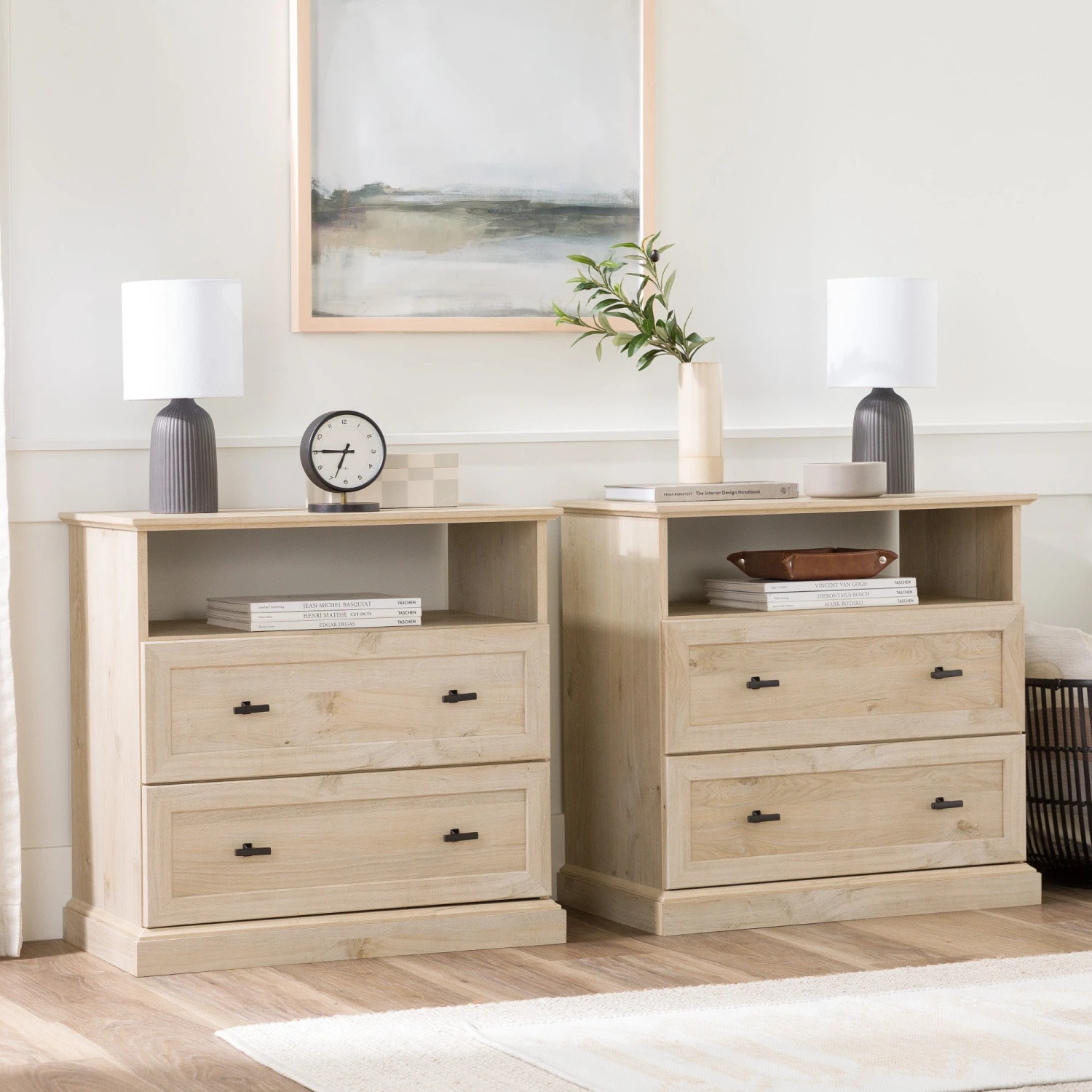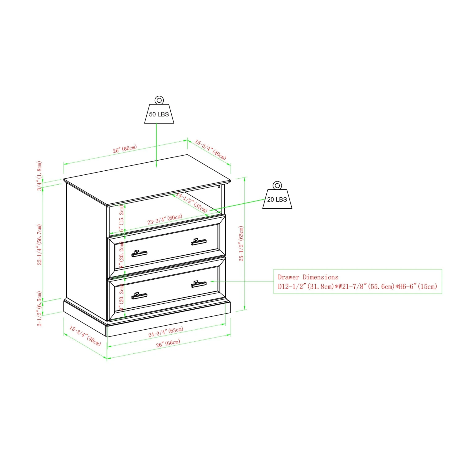 Straightforward and reliable, this classic two-drawer nightstand is a trustworthy addition to any room. This transitional style end table includes two drawers, so you can store a wide variety of accessories and improve your organization along the way. Each drawer has metal telescoping glides that allow smooth access to your prized possessions. This accent stand also features on open cubby so you can quickly find bedtime essentials or TV remotes.